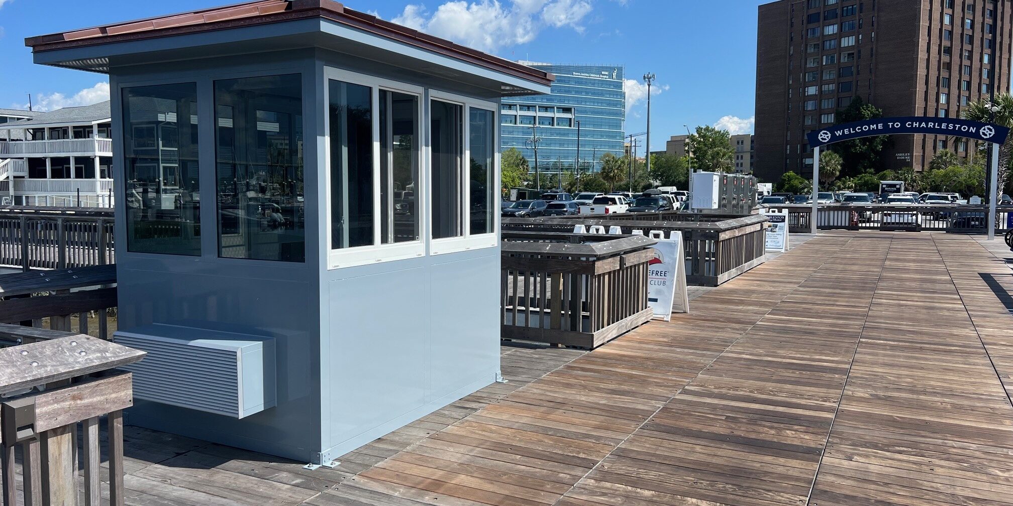 Safe Harbor Marina located in Charleston, South Carolina needed to put a booth for customers who use the marina to visit and store boats. The booth is located directly on the dock allows for the employees of Safe Harbor to provide excellent customer service and provide any upgraded services to the customers of Safe Harbor. This booth was custom sized to fit the existing location. It has a standing seam copper roof, multiple sliding windows, painted exterior, pre-wired electrical package and wall-mounted heating & cooling system.