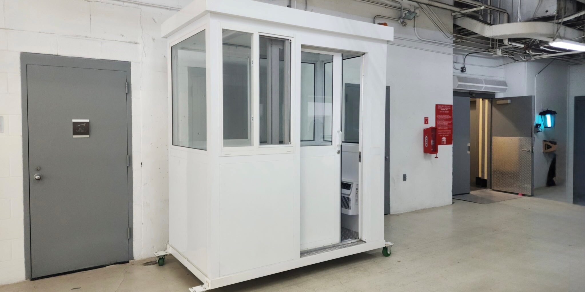 Esperante Corporate Center in West Palm Beach, Florida needed to come up with a mobile security solution because they have a very busy loading and receiving dock but didn’t have the permanent space to install one of our standard booths. They decided to purchase our Mobile Security Booth that they can move through out the property and plug into the wall for power. This booth is 4’ x 7’ and has a wall-mounted heating & cooling unit, sliding door, plastic laminate workstation, aluminum floor, and tempered safety glass. These booths are customizable to fit each site’s needs. It is manufactured out of heavy-duty aluminum construction which makes it very light and easily moveable for one person to use.